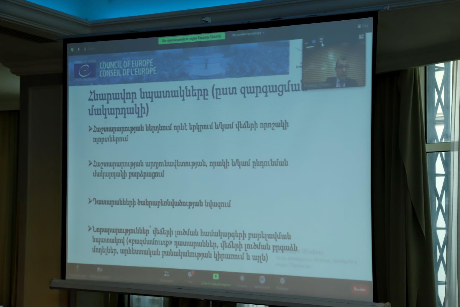 Հաշտարարները, փաստաբանները, տարբեր դատական ատյանների դատավորները և ՀՀ արդարադատության նախարարության ներկայացուցիչները 2022 թվականի մարտի 29-ին քննարկեցին Եվրոպայի խորհրդի միջազգային փորձագետի կողմից ներկայացված Հաշտարարության զարգացման գործիքակազմը: Միջոցառման ընթացքում տեղի ունեցավ նաև մտքերի փոխանակում հաշտարարության ոլորտում առկա մարտահրավերների և Եվրոպայի խորհրդի չափանիշների ու անդամ պետությունների լավագույն փորձի լույսի ներքո երկրում հաշտարարության հետագա զարգացումը խթանելու համար անհրաժեշտ քայլերի վերաբերյալ: Մասնակիցները հնարավորություն ունեցան ծանոթանալու Հայաստանի հաշտարարների ինքնակարգավորվող կազմակերպության նոր կայքին (www.mediators.am), որը մշակվել է Հայաստանի հաշտարարների ինքնակարգավորվող կազմակերպությանը ցուցաբերված աջակցության շրջանակներում:
